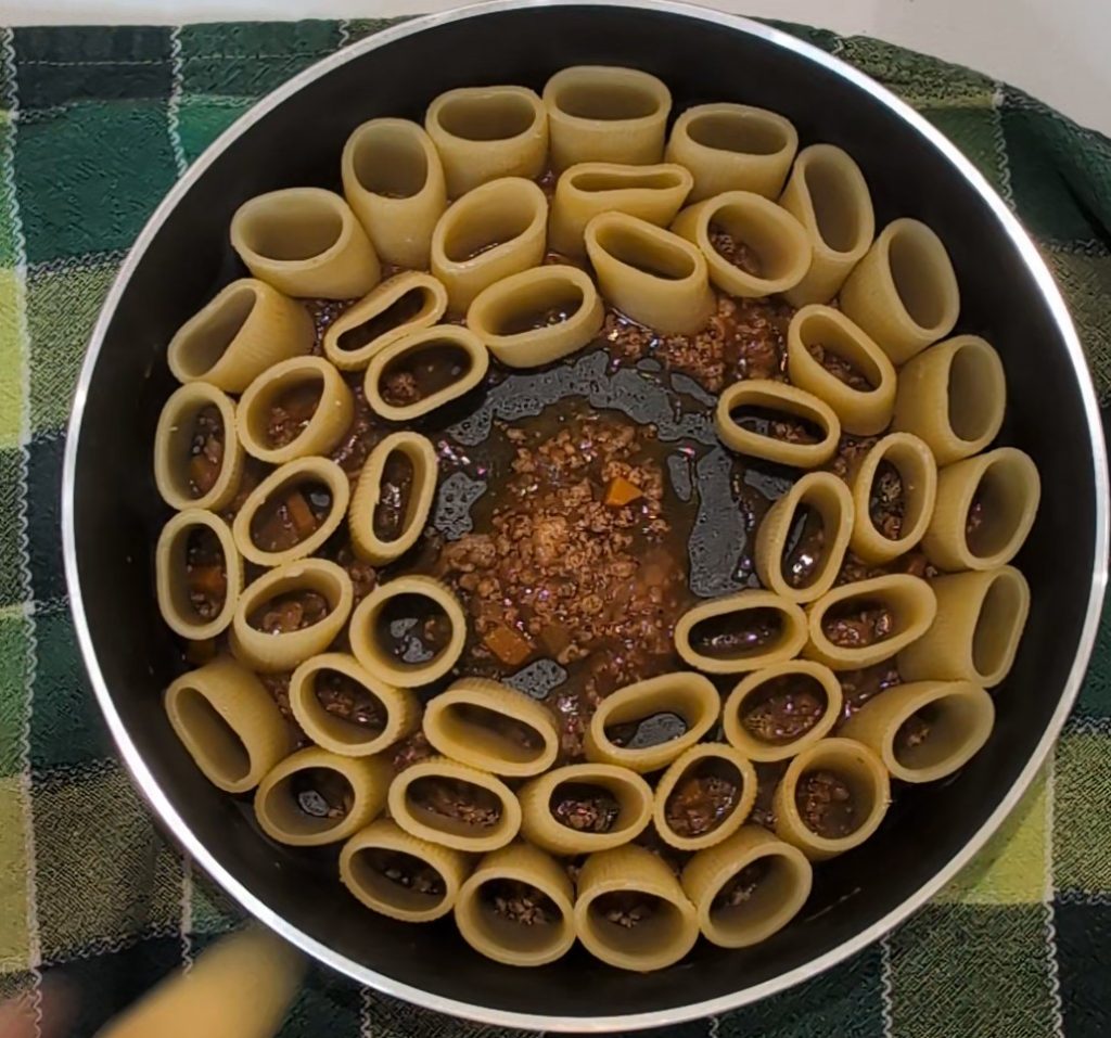 Während das Ragù seine langsame Garzeit beendet und die Béchamelsauce ruht, bringen wir in einem großen Topf reichlich Wasser zum Kochen. Leicht salzen und die Nudeln hineingeben. In meinem Fall habe ich eine kurze und breite Pastaform gewählt, ähnlich den Paccheri, aber mit einem noch größeren Durchmesser, ideal zum Füllen. Die Kochzeit sollte kurz sein, nur 4 Minuten, damit die Pasta al dente bleibt und beim Füllen ihre Form behält.