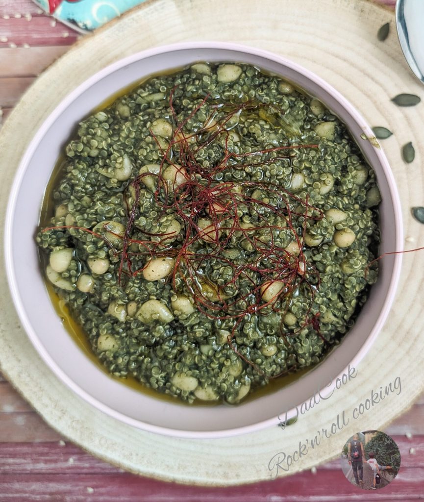 • Deine cremige Quinoa- und Bohnensuppe mit Spirulina ist fertig zum Genießen! Für einen letzten Farbtupfer und etwas Schärfe habe ich mit Chilifäden garniert. Lass deiner Fantasie freien Lauf und wähle die Variante, die deinen Gaumen am meisten begeistert und guten Appetit von DadCook!