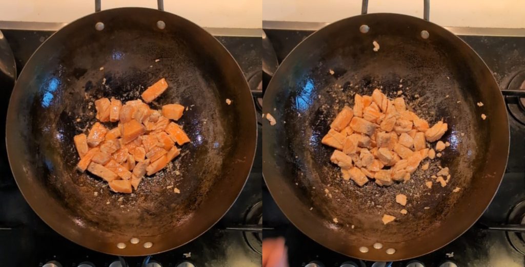 Sobald die Pasta gut vermengt ist, schalten Sie die Hitze aus. Fügen Sie den angebratenen Lachs hinzu, den Sie beiseite gelegt haben, und zerkleinern Sie ihn vorsichtig mit einer Gabel, um ihn gleichmäßig auf der Pasta zu verteilen. Vermengen Sie alles sorgfältig, um den Lachs mit dem Gewürz zu verbinden.