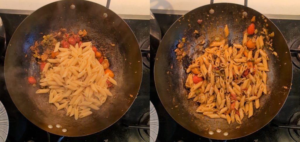 Fügen Sie dann die zuvor vorbereitete Oliven-Kapern-Mischung hinzu und löschen Sie mit einer halben Kelle Nudelkochwasser ab. Dieser Schritt hilft, das Aroma des Gewürzes zu verstärken. Decken Sie die Pfanne mit einem Deckel ab und schalten Sie die Hitze aus.