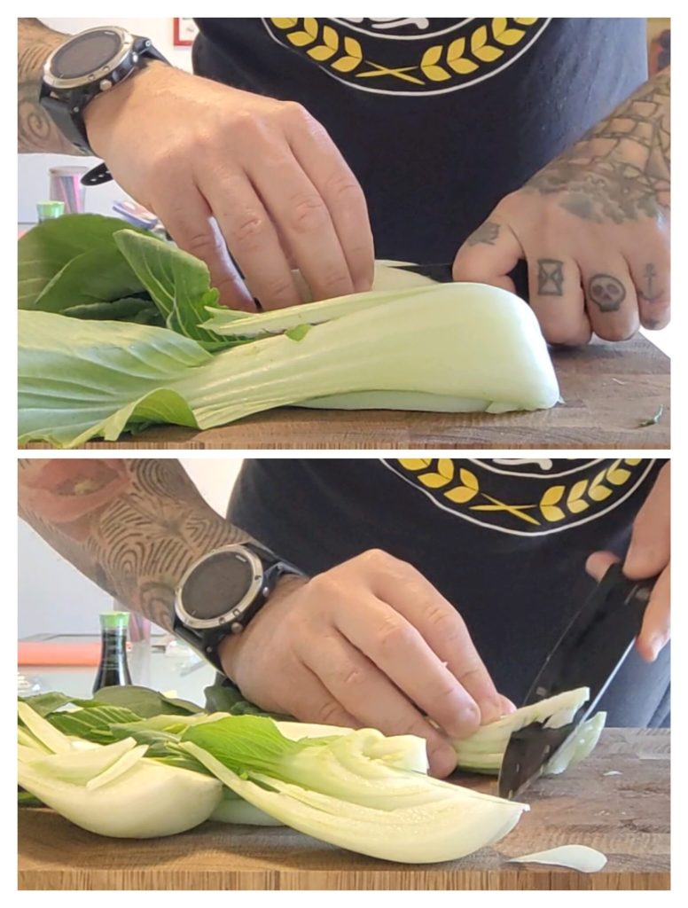 • Um den chinesischen Pak Choi Kohl zuzubereiten, halbieren wir zuerst das Gemüse und nachdem wir das härteste Mittelstück abgeschnitten und entfernt haben, waschen wir es gründlich mit kaltem Wasser.