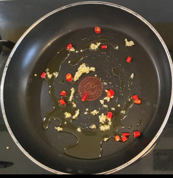 • Danach habe ich einen Sauté mit nativem Olivenöl extra, scharfem Peperoni, zerdrücktem Knoblauch vorbereitet und einige Sekunden lang gebraten, nur um das Öl zu aromatisieren.