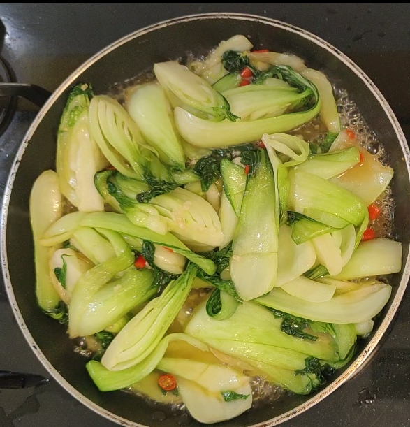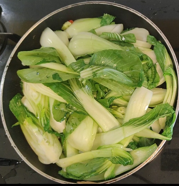 • Jetzt gebe ich den bereits gewaschenen und gut getrockneten chinesischen Pak Choi Kohl hinzu, lasse ihn 5 Minuten lang bei schwacher Hitze mit dem Sauté kochen und drehe ihn oft um.