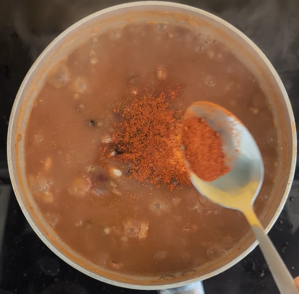Schließlich können wir am Ende der Garzeit ein Gewürz nach Wahl hinzufügen, um die Suppe noch schmackhafter zu machen. Einige Ideen sind: süßes oder scharfes Paprikapulver, Kurkuma, scharfe Chiliflocken. Ich habe scharfes Chilipulver hinzugefügt.