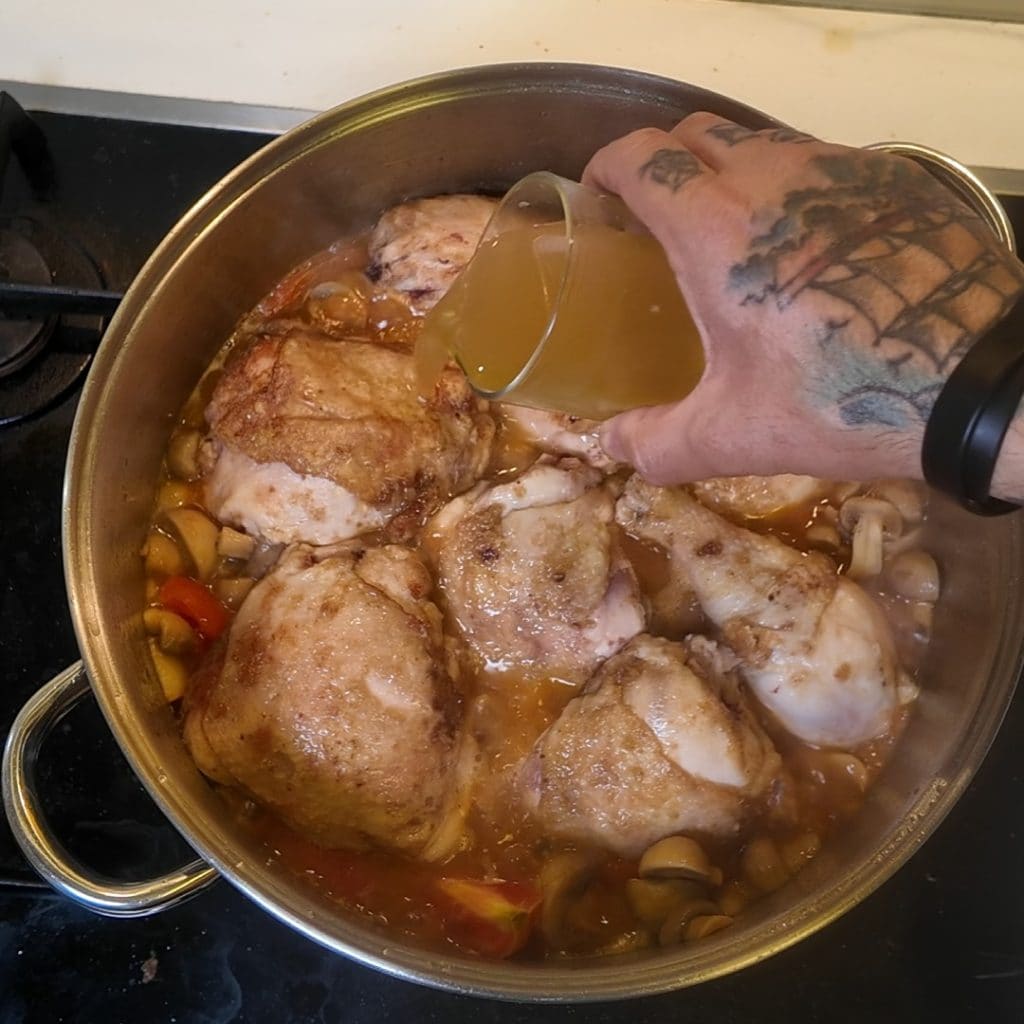 Sobald der Alkohol des Weins verdampft ist, die Hühnerstücke in den Topf zurückgeben.
