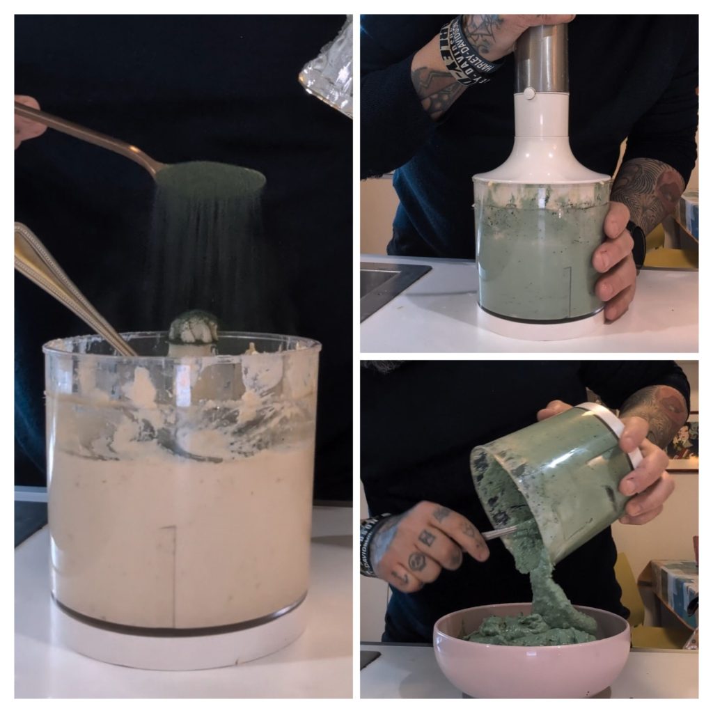 Nachdem du das Hummus erhalten hast: Füge das Spirulina-Pulver hinzu und püriere erneut, um es zu vermengen, und passe die Konsistenz bei Bedarf mit Wasser an.