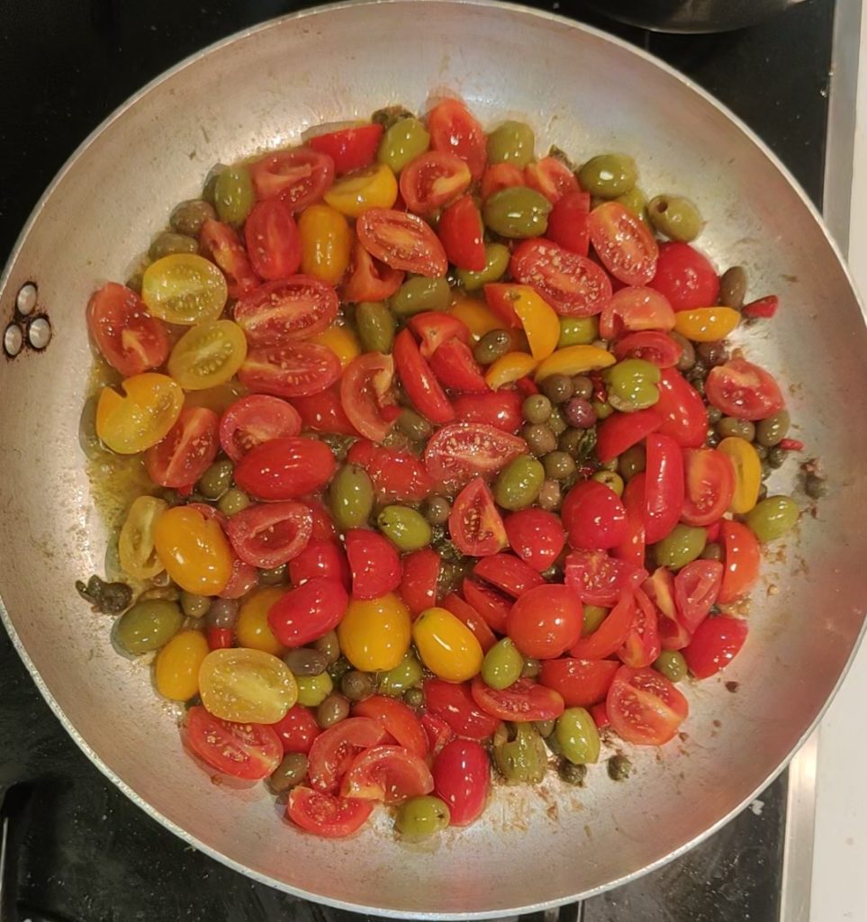In der Zwischenzeit habe ich gelbe und rote Kirschtomaten halbiert und als ich sie alle geschnitten hatte, habe ich sie zusammen mit den Oliven zur Pfanne hinzugefügt.