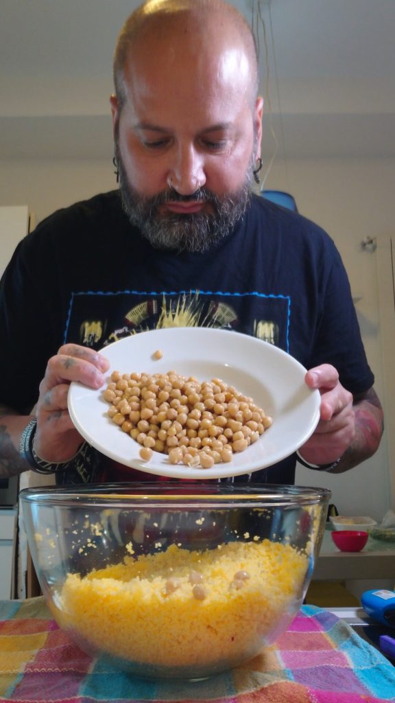 Füge alle geschnittenen Zutaten in die Schüssel mit dem Couscous hinzu: das frische Gemüse, die gut abgetropften und gewaschenen Kichererbsen.