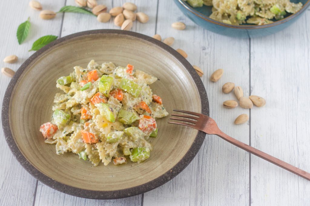 Den kalten Nudelsalat mit Pistazienpesto im Kühlschrank in einem luftdichten Behälter für maximal 8 Stunden aufbewahren.