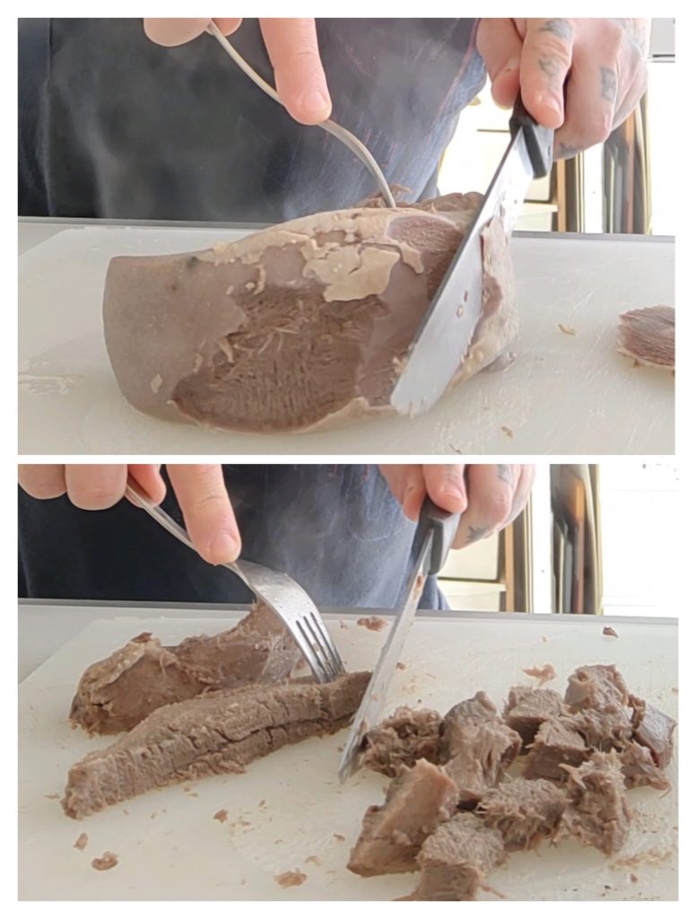 Lassen Sie die Rinderzunge bei Raumtemperatur abkühlen. Reinige die Zunge mit einem scharfen Messer, indem die härtere Haut entfernt wird. Schneide die Zunge in Würfel der gewünschten Größe.