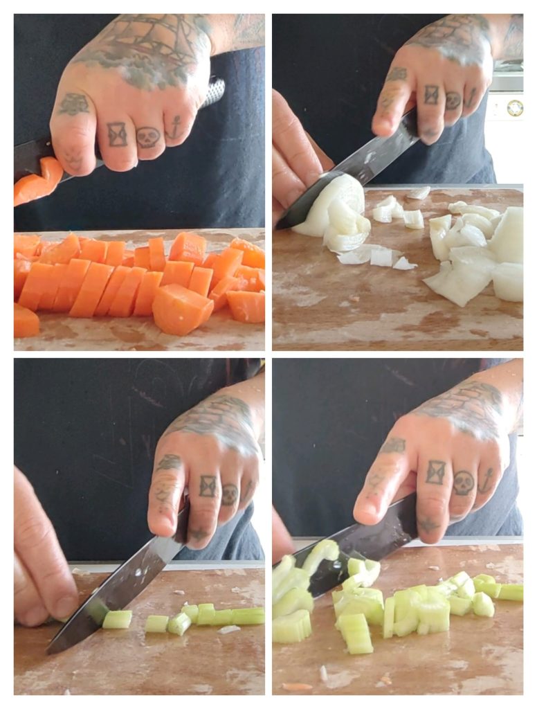 Um die Karnevalsuppe zuzubereiten, beginnen wir mit einem intensiv schmeckenden Gemüsesoffritto. Schneiden Sie den Sellerie, die Karotten und die Zwiebel in grobe Stücke: Auf diese Weise zerfallen sie während des Kochens nicht vollständig und verleihen der Suppe eine angenehme Konsistenz und einen kräftigeren Geschmack.