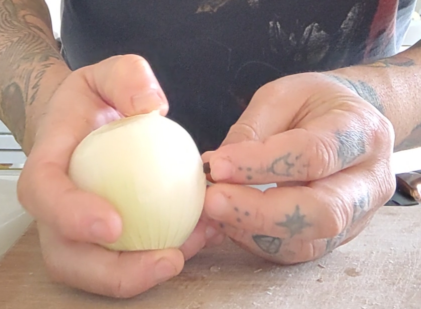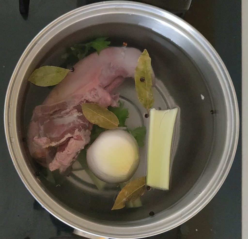 Bereite die Rinderzunge vor: Spüle die Zunge gründlich unter fließendem Wasser ab. Stecke zwei Nelken in zufällige Löcher in die Zwiebel. In einem großen Topf die Zunge, die Zwiebel mit den Nelken, den Sellerie, die Karotte, das Lorbeerblatt, das Salz und den weißen Pfefferkörner zusammenfügen. Mit kaltem Wasser bedecken und zum Kochen bringen.