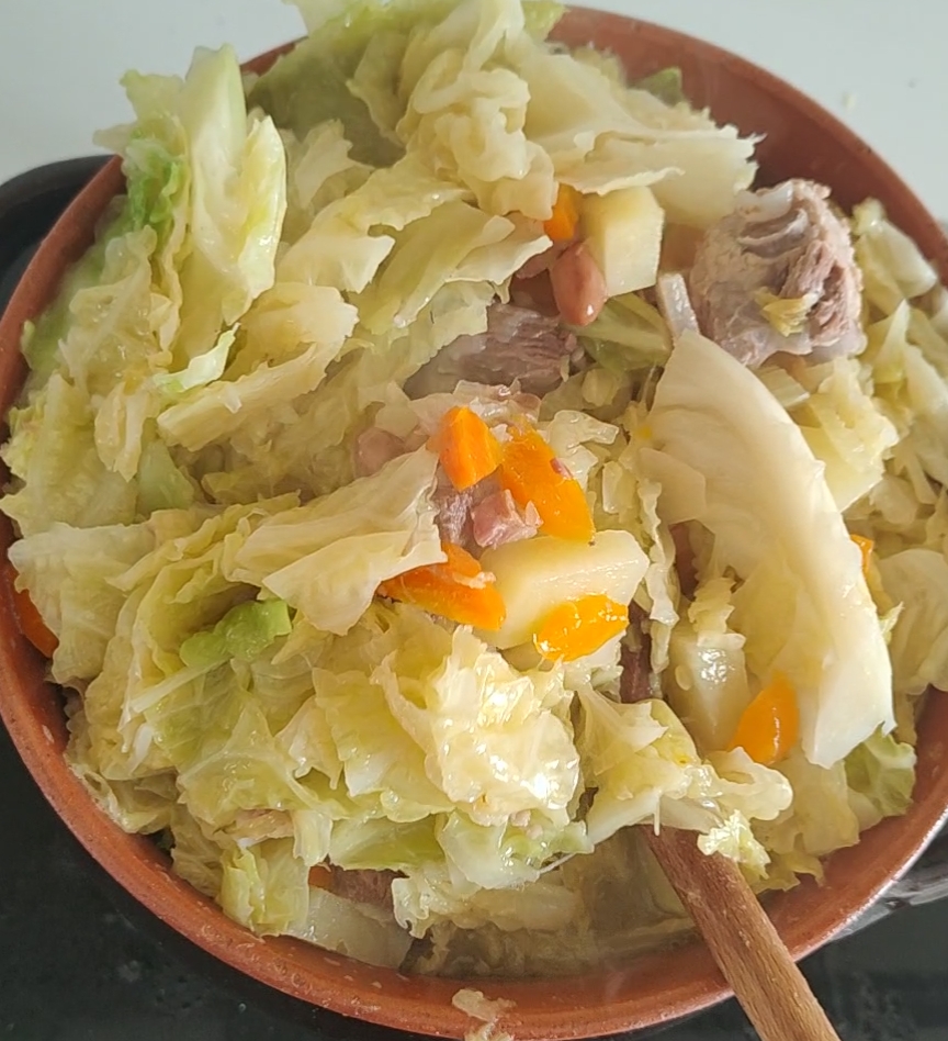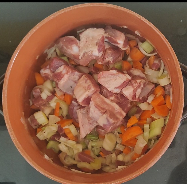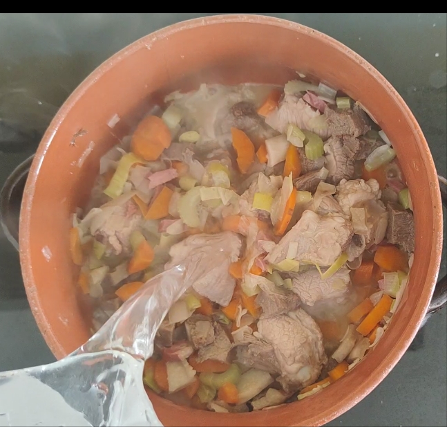 Sobald es kocht, fügen wir das Salz hinzu und würzen nach Belieben mit Pfeffer. Decken Sie den Topf mit einem Deckel ab und lassen Sie ihn etwa 2 Stunden lang bei schwacher Hitze köcheln, oder bis die Rippchen und die Schweineschwarte weich genug sind.