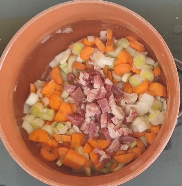 Für ein goldenes und duftendes Soffritto: In einem Tontopf schmelzen wir bei schwacher Hitze ein Stück Butter zusammen mit einem Schuss nativem Olivenöl extra. Fügen Sie das in grobe Stücke geschnittene Gemüse hinzu: Sellerie, Karotten und Zwiebel. Lassen Sie es etwa 10 Minuten lang sanft anbraten, dabei gelegentlich umrühren, bis das Gemüse goldgelb und wohlriechend ist.