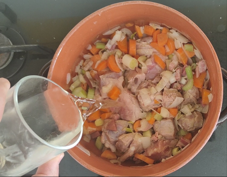 Zu diesem Zeitpunkt gießen wir ein halbes Glas trockenen Weißwein in den Topf. Lassen Sie den Wein bei schwacher Hitze verdampfen, dabei gelegentlich umrühren, bis der alkoholische Geruch vollständig verschwunden ist.