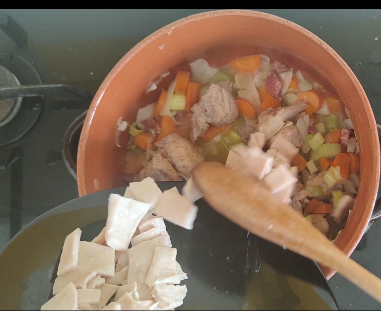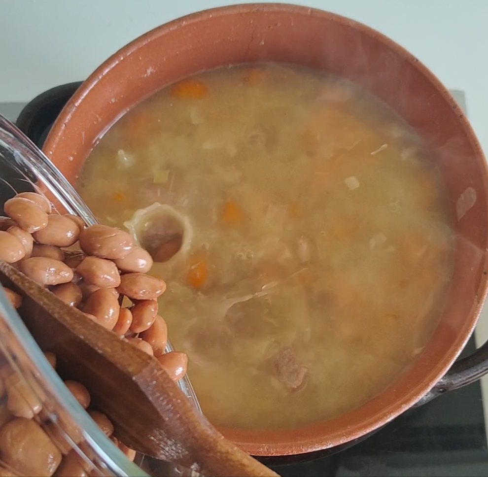 Genauso fügen wir die Bohnen und Kartoffeln hinzu. Beide Zutaten benötigen eine kürzere Garzeit als die Rippchen und die Schweineschwarte. Wenn man sie zu diesem Zeitpunkt hinzufügt, bleiben sie intakt und knackig, und verleihen der Suppe einen Hauch von Farbe und Konsistenz.