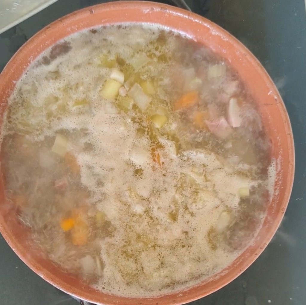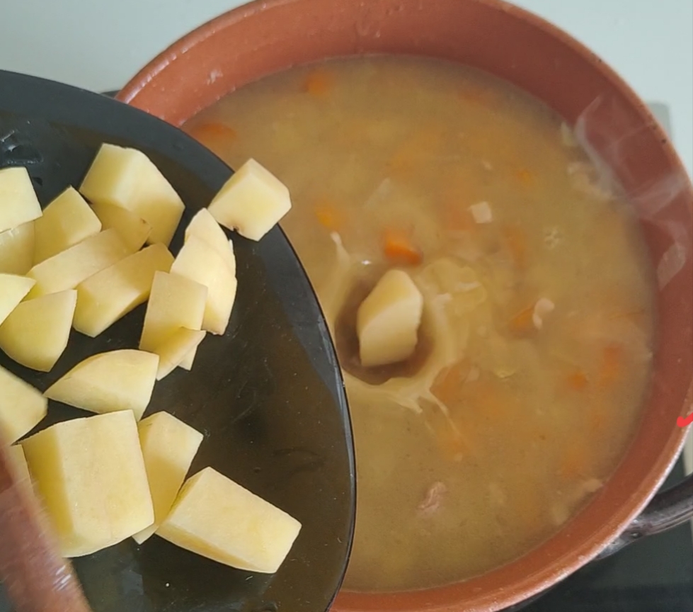 Nach der erforderlichen Zeit zum Kochen der Rippchen und der Schweineschwarte (ca. 2 Stunden) können wir die Kartoffeln hinzufügen. Die Kartoffeln verleihen der Suppe eine cremige Konsistenz und einen noch reicheren Geschmack.