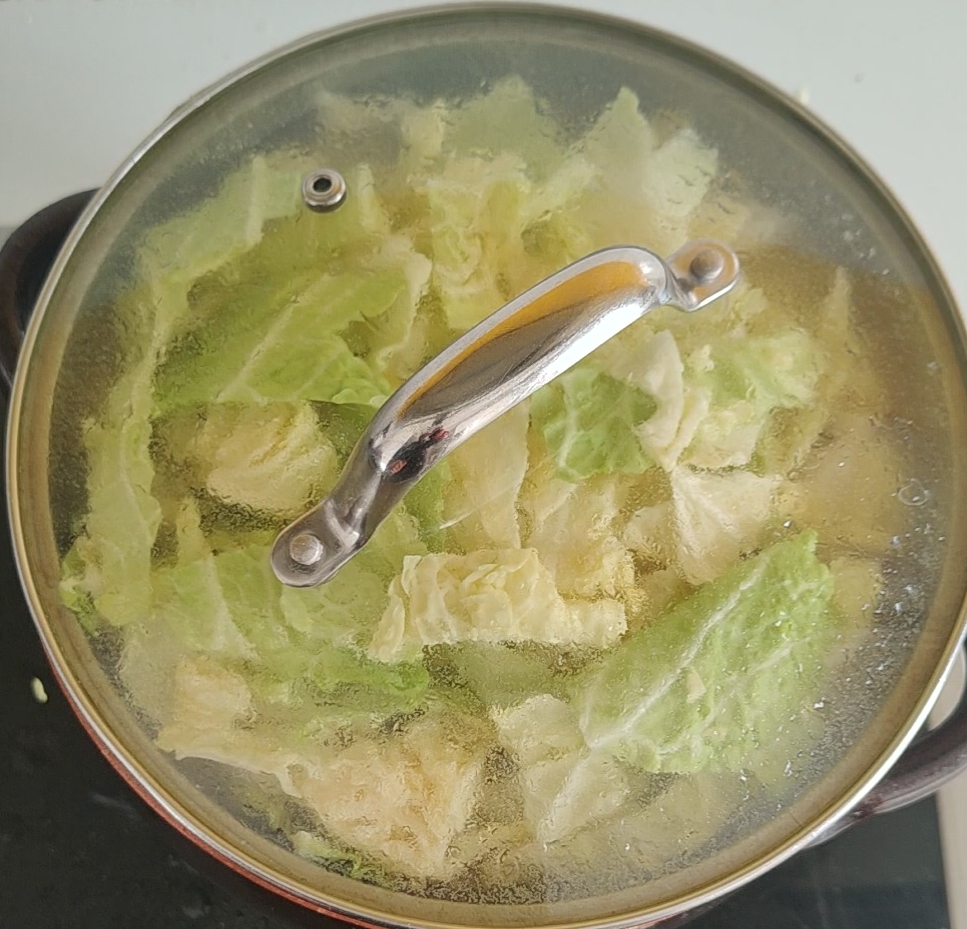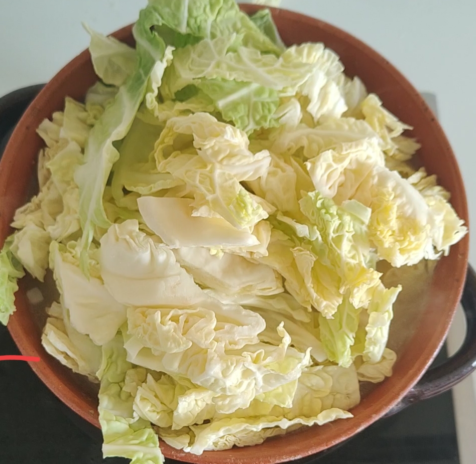 Zuletzt fügen wir den in Streifen geschnittenen Wirsing hinzu. Der Wirsing wird zusammen mit den Kartoffeln und Bohnen gekocht, und verleiht der Suppe einen Hauch von Frische und Farbe.