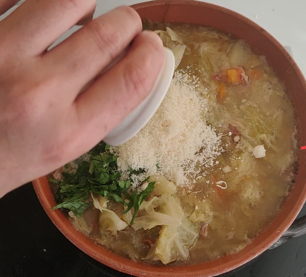 Fünf Minuten vor dem Ausschalten des Herds, fügen wir der Suppe den geriebenen Käse, die gehackte Petersilie und, falls gewünscht, eine Prise schwarzen Pfeffer hinzu. Diese Zutaten verleihen der Suppe einen noch intensiveren Geschmack und ein unwiderstehliches Aroma.
