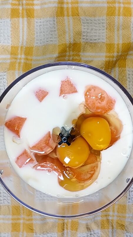 Beginne damit, die Karotten gründlich zu reinigen und in Stücke zu schneiden.Lege sie in den Mixbecher (der vom Pürierstab ist vollkommen in Ordnung) zusammen mit den Eiern, dem Zucker, der Milch und dem Öl.
