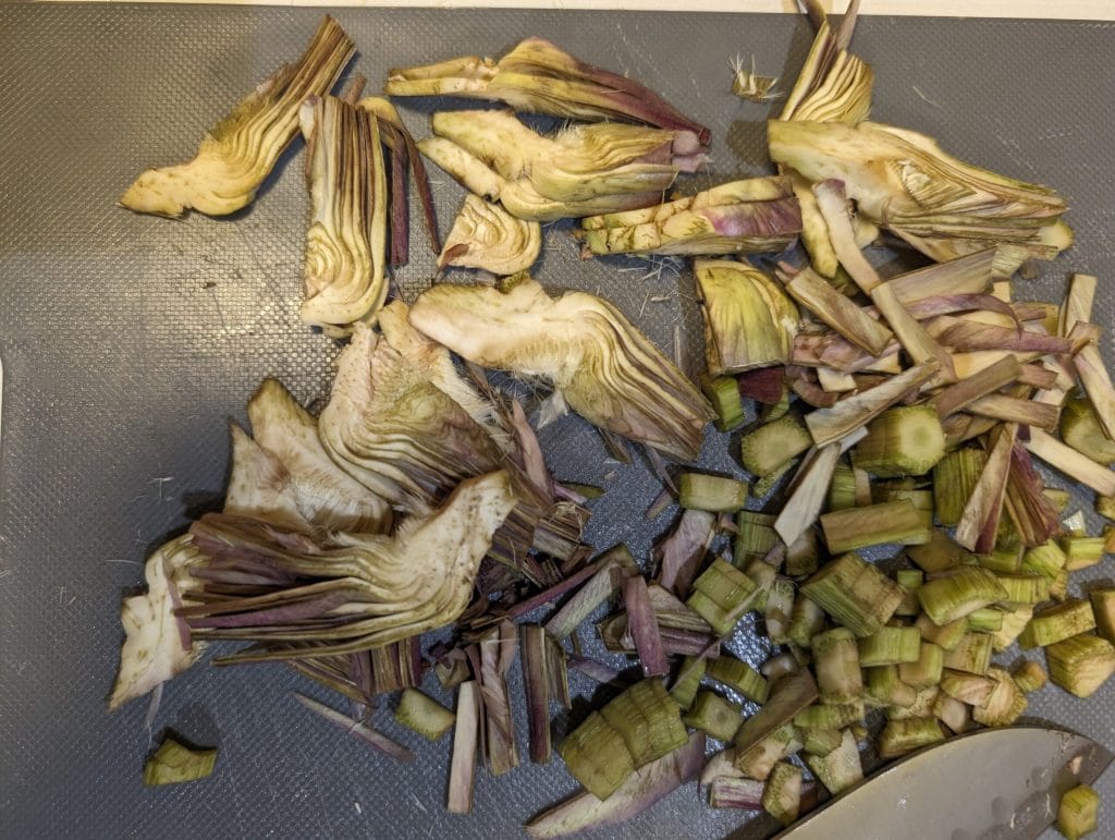 Nachdem wir den Speck geschnitten und beiseite gelegt haben, widmen wir uns den Artischocken: reinigen und in dünne Scheiben schneiden, und sie nach und nach in mit Zitrone angesäuertes Wasser tauchen, um Oxidation zu vermeiden. Vergessen wir nicht den Stiel: schneide ihn in Würfel und füge ihn dem Rest der Artischocke hinzu für ein vollständiges und schmackhaftes Gericht. Eine Prise schwarzer Pfeffer wird den Geschmack dieses Rezepts abrunden.