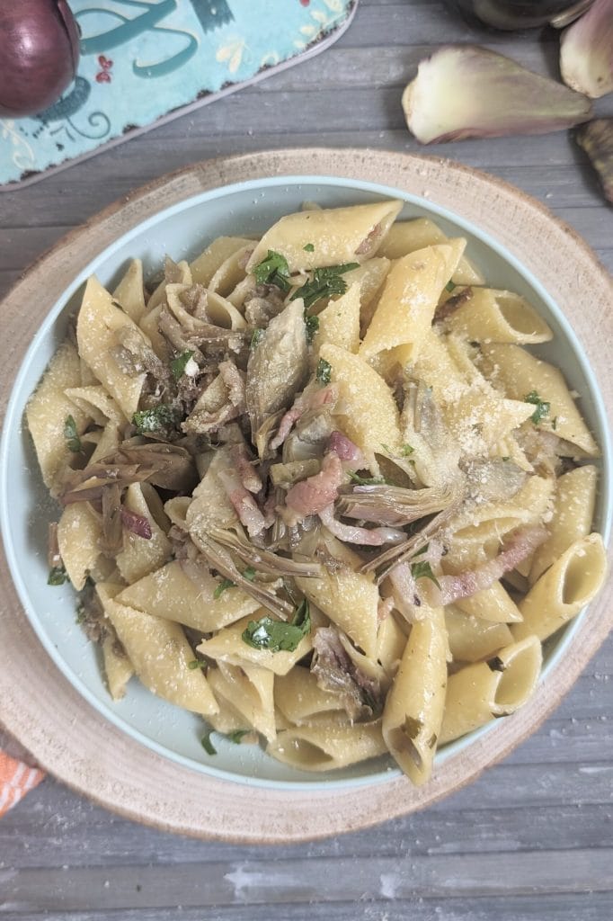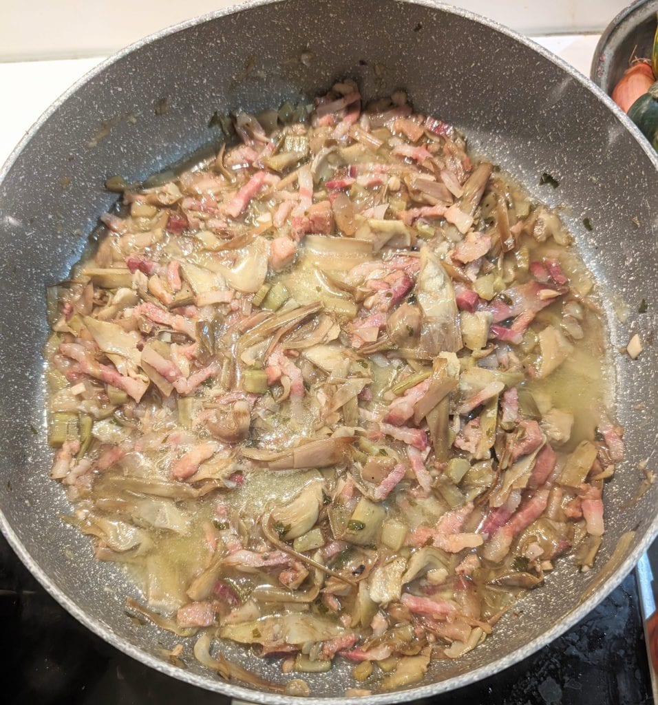 Lassen wir die Artischocken und den Speck etwa 20 Minuten kochen, gelegentlich umrühren. In der Zwischenzeit kochen wir die Pasta in der Form, die uns am besten gefällt, ob kurz wie Penne oder lang wie Spaghetti. Ich habe große und glatte Penne verwendet.