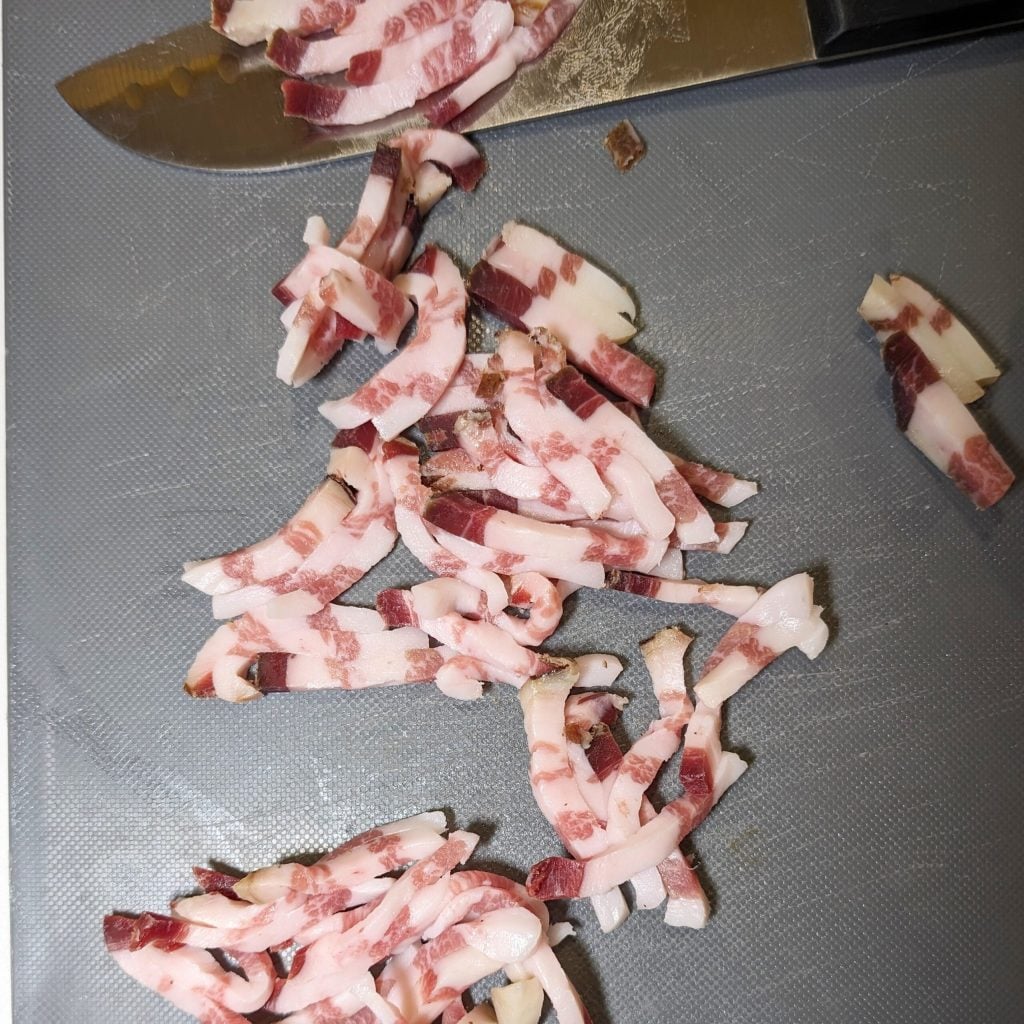 Entfernen wir die Schwarte vom Speck, den äußeren harten und fetten Teil und säubern den Speck auch von dem zu stark gewürzten äußeren Teil. Schneide den Speck in dünne Streifen, die gleichmäßig garen, sich besser in der Pasta verteilen und eine angenehme Konsistenz am Gaumen bieten. Die Breite der Streifen kann je nach persönlichem Geschmack variieren. Wenn du eine knusprigere Textur bevorzugst, schneide sie noch dünner. Speckstreifen garen schnell, also nicht zu lange kochen, um zu vermeiden, dass sie trocken und hart werden. Jetzt, da der Speck bereit ist, können wir mit dem Rest des Rezepts weitermachen!