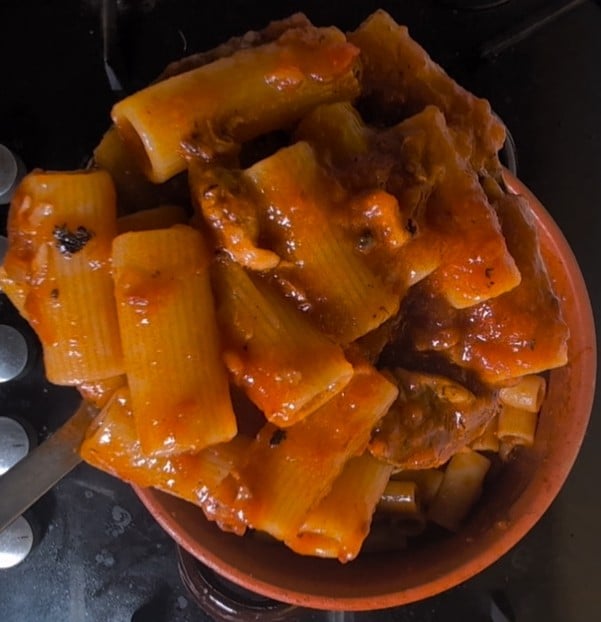 Zum Schluss kochen wir die Pasta (Rigatoni, große Penne oder eine andere Sorte nach Belieben) al dente. Die Pasta abgießen und zur noch heißen Sauce hinzufügen. Kräftig umrühren, um die Pasta gut mit der Sauce zu vermengen. Falls nötig, eine Kelle Kochwasser der Pasta hinzufügen, um die Sauce cremiger zu machen. Die Pasta sollte gut mit der Sauce überzogen und leicht al dente sein. Einen Hauch frisch gemahlenen Pfeffer hinzufügen: Der frisch gemahlene Pfeffer verleiht dem Gericht einen intensiveren Geschmack.