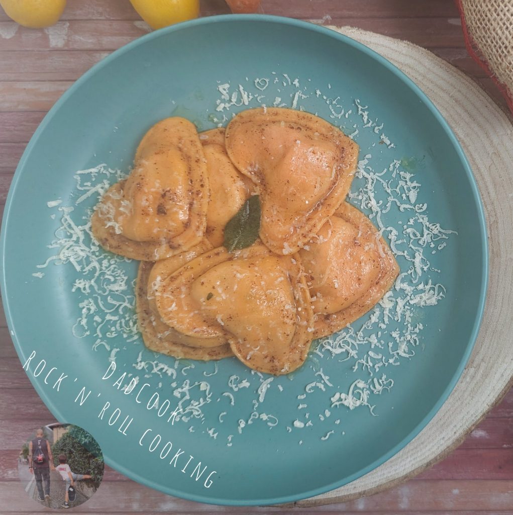• Die Ravioli mit Butter und Salbei mit schmelzenden Mozzarella-Herzen sind bereit, angerichtet und noch heiß serviert zu werden. Bestreuen Sie sie vor dem Genuss mit geriebenem Grana Padano. Guten Appetit von DadCook!