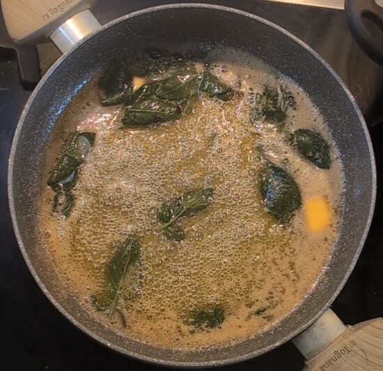 • Wenn die Butter vollständig geschmolzen ist, geben wir die frischen Salbeiblätter in die Pfanne. Lassen Sie den Salbei bei mittlerer bis niedriger Hitze einige Minuten anbraten, bis er knusprig wird. Seien Sie vorsichtig, dass Sie den Salbei nicht verbrennen, da der Geschmack des Dressings sonst bitter werden könnte.