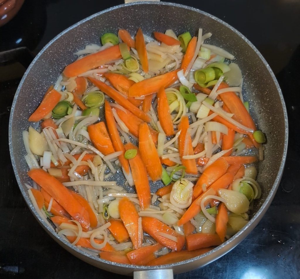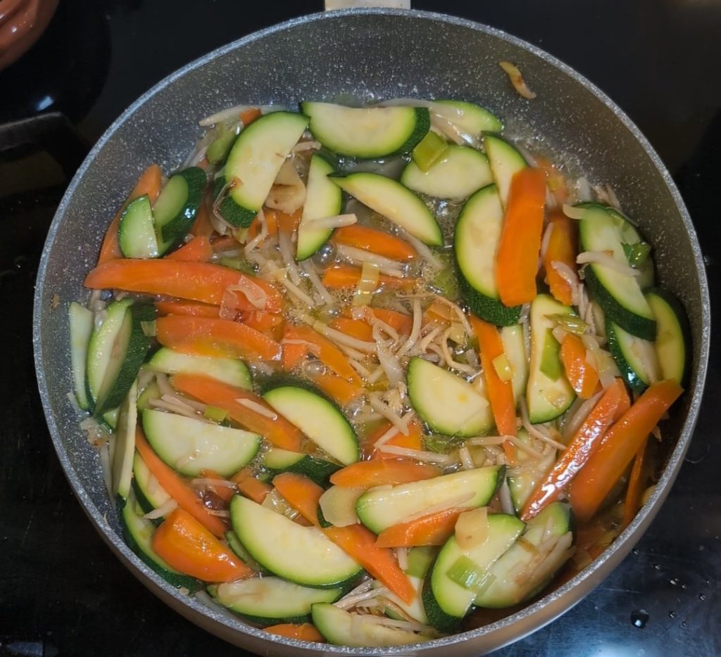 Wir beginnen, das Gemüse zu kochen. Da die Garzeiten unterschiedlich sind, garen wir es schrittweise. Zuerst geben wir die Karotten, den Lauch und die Bambussprossen in eine Pfanne mit extra nativem Olivenöl. Wir lassen sie bei mittlerer Hitze einige Minuten weich werden. Sobald die Karotten ihre Konsistenz ändern, fügen wir die Zucchini hinzu und braten alles zusammen für weitere 2-3 Minuten an. Das Gemüse sollte knackig sein und nicht zerfallen.