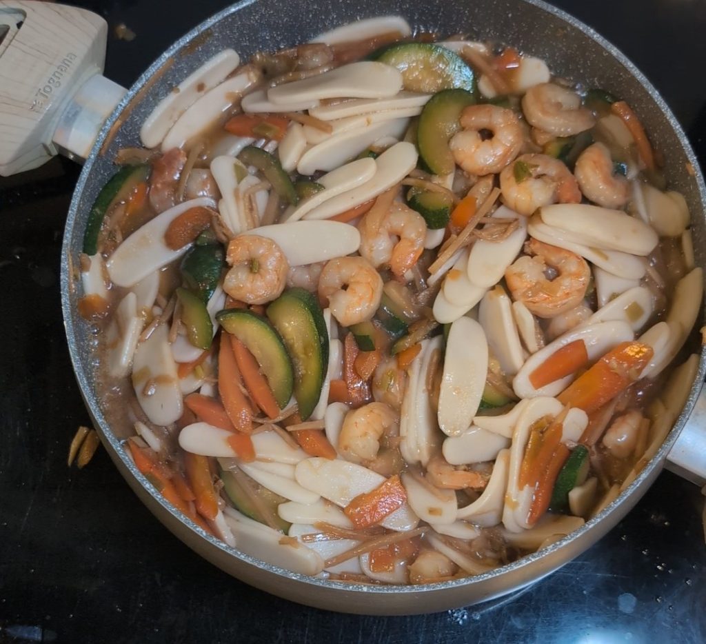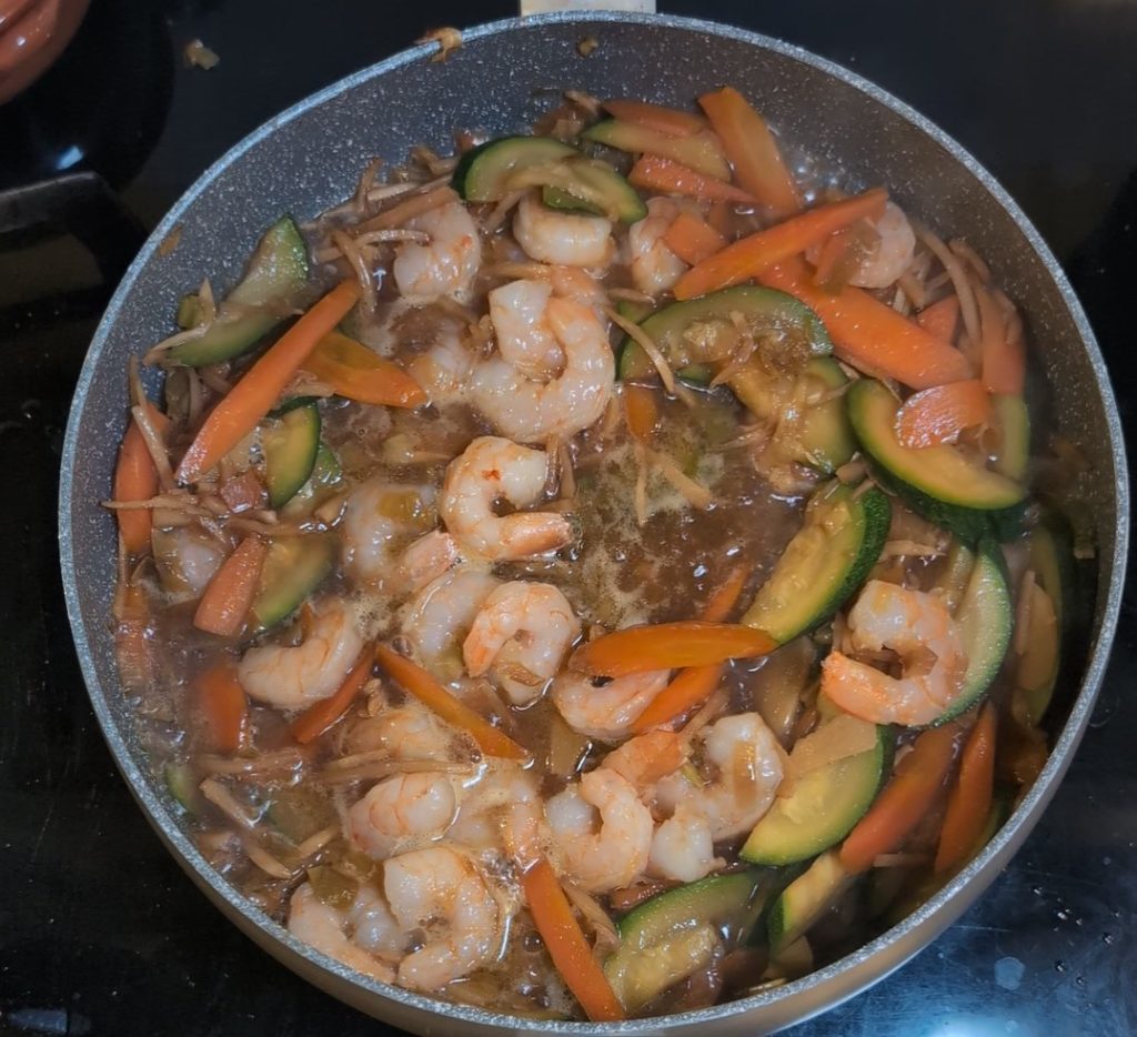 Jetzt, da etwa 10 Minuten seit Beginn vergangen sind, ist das Gemüse gekocht, aber noch knackig. Wir können nun die Garnelen zur Sauce hinzufügen. Rühren wir vorsichtig für eine Minute um, nur lange genug, damit sie Geschmack annehmen. Kocht die Garnelen nicht zu lange, sonst werden sie zäh.
