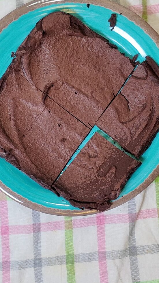 In 4 großzügige Portionen schneiden.Genieße die weiche, dichte und schokoladige Konsistenz deines Brownies!