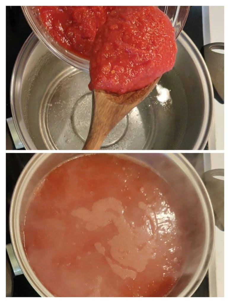 Erst wenn sie auf beiden Seiten gut geröstet sind, beginnen wir nach und nach das Wasser mit der Tomatensauce hinzuzufügen, das wir zuvor vorbereitet haben.