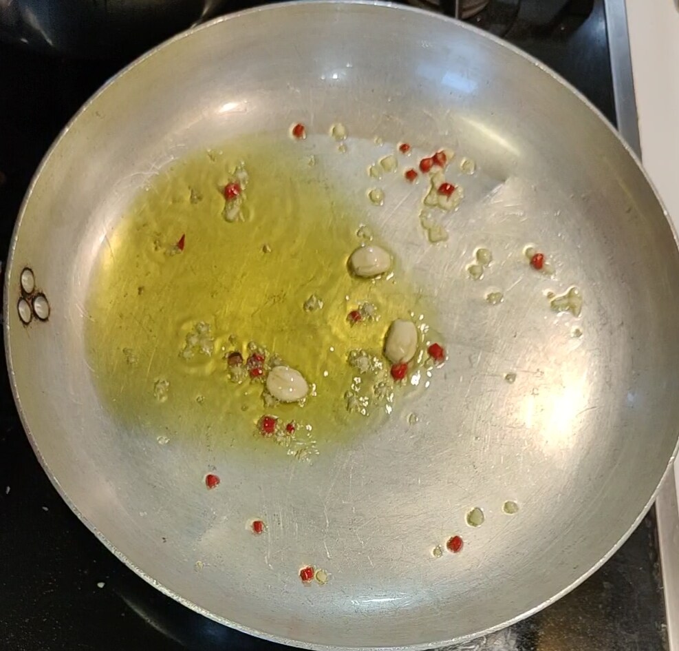 Während das Wasser kocht, braten wir in einer Eisenpfanne den fein gehackten scharfen Peperoncino, eine zerdrückte Knoblauchzehe und zwei ganze Zehen an.