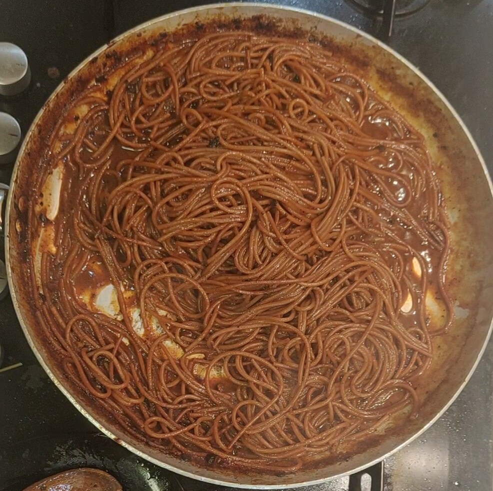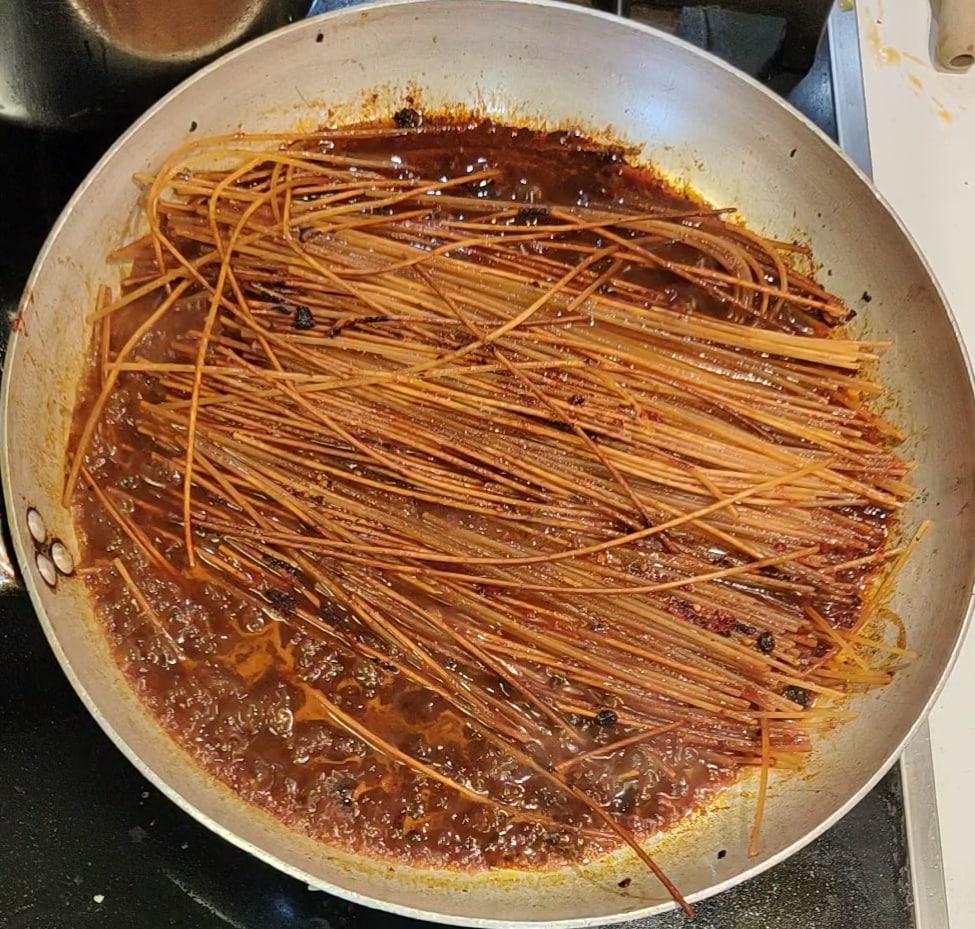 Ja, es kann passieren, dass man weichere Spaghetti und knusprigere Spaghetti isst, weil sie neben dem Rösten auch haften geblieben sind. Aber das ist der beste Teil.