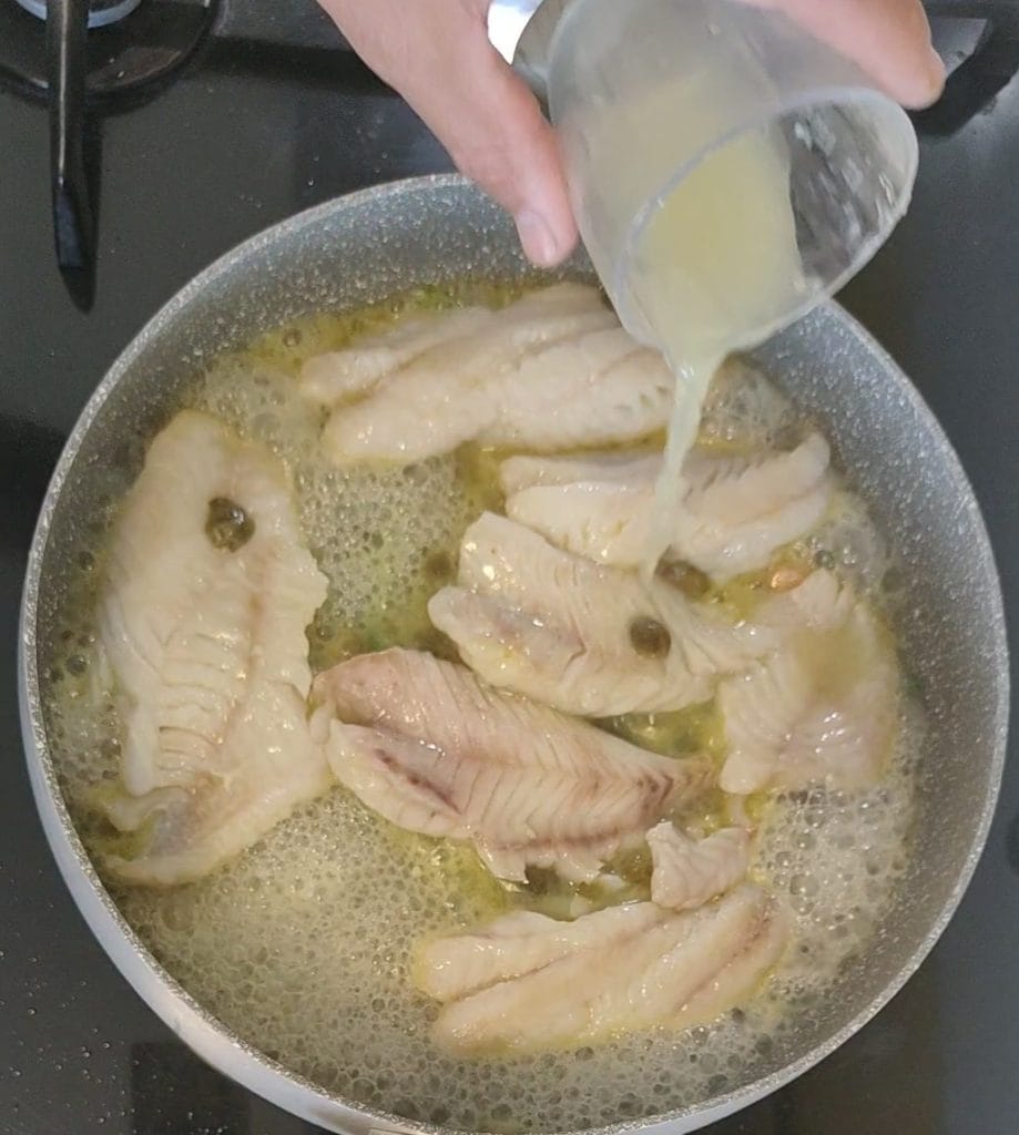 Nach dem Anbraten des Knoblauchs, der Kapern und der Petersilienstängel für ein paar Sekunden, füge ich die Steinbuttfilets hinzu und nachdem ich sie auf beiden Seiten gebräunt habe, lösche ich mit Weißwein ab.