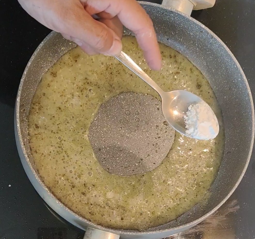 Dann entfernte ich den Steinbutt und mit einer Prise Maisstärke verdickte ich alle Kochsäfte, um den Steinbutt zurückzugeben und das Kochen abzuschließen.