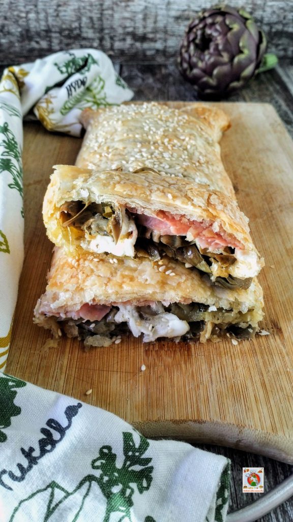 Sie können den Artischocken-Schinken-Strudel auch mit Provola-Scheiben oder Fontina anstelle von Fiordilatte füllen. Alternativ können Sie auch Ricotta verwenden.