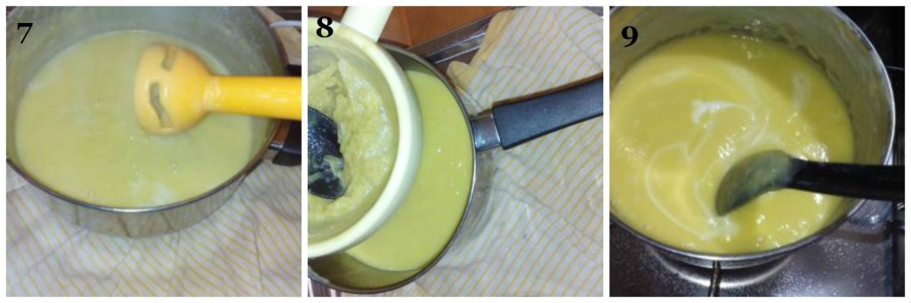 Mit einem Stabmixer oder Standmixer den Fenchel zu einer Creme verarbeiten (7). Die Fenchelcreme durch ein Sieb streichen (8) und dann die flüssige Sahne hinzufügen (9). Die Fenchelsuppe zurück auf den Herd stellen und weitere 5 Minuten kochen, damit sie sich weiter verdickt.