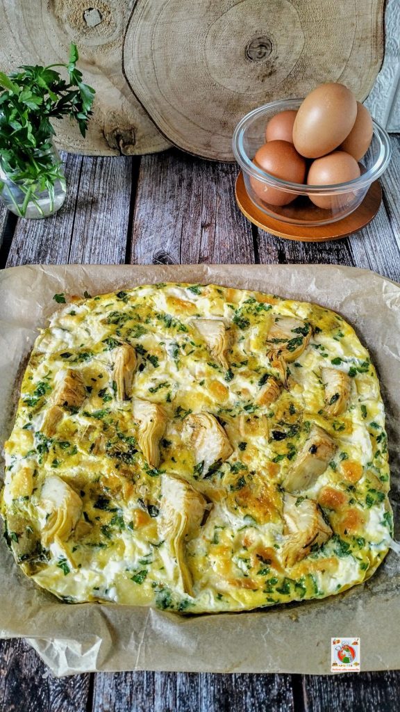 Sie können sowohl frische als auch gefrorene Artischocken verwenden, die sich als praktischere und schnellere Wahl erweisen: einfach in der Pfanne anbraten, um Geschmack zu verleihen, dann zu den verquirlten Eiern mit Petersilie und einer Prise Salz (auf Wunsch auch Pfeffer und geriebener Parmesan) geben. Abgerundet wird alles durch Provola-Würfel, die beim Backen schmelzen, und dekorierte Artischockenspalten, für ein Omelett, das an eine herzhafte Torte erinnert, schön anzusehen und köstlich zu genießen.
