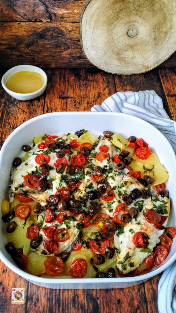 Die im Ofen gebackenen Goldbrassenfilets mit Kartoffeln und Oliven sind ein köstliches Fischgericht, ideal für besondere Anlässe.