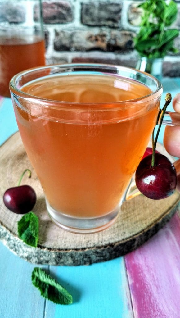 Dieses Getränk kombiniert die antioxidativen Vorteile von grünem Tee, die Vitamine der Kirschen und die tonisierende und verdauungsfördernde Wirkung der Minze und bietet ein gesundes und erfrischendes Getränk.