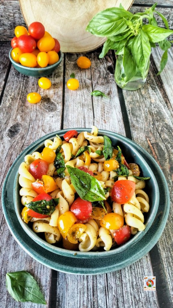 Der kalte Nudelsalat mit Kirschtomaten und Basilikum ist ein köstliches erstes Gericht, das die Frische und Leichtigkeit des italienischen Sommers einfängt.