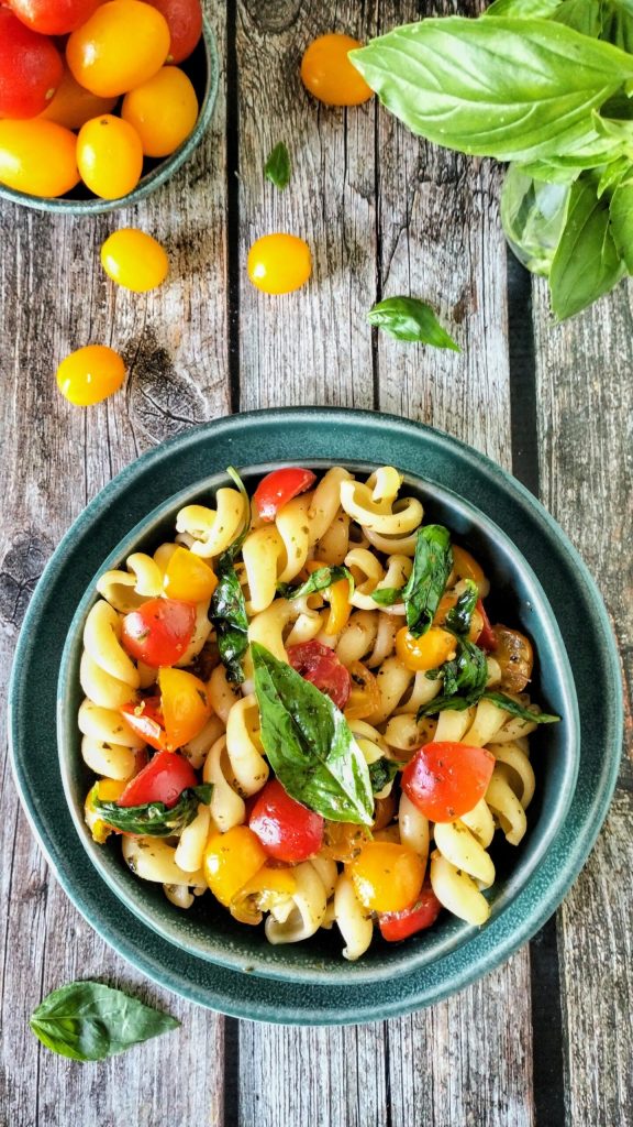 Kalter Nudelsalat mit Kirschtomaten und Basilikum