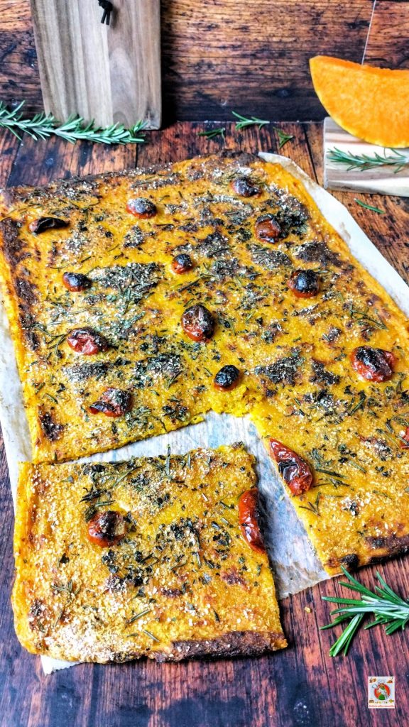 Kürbisschiacciata mit Ofentomaten: Eine Geschmacksexplosion, die man schnell und ohne Eier zubereiten kann.
