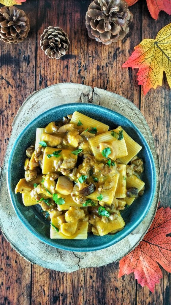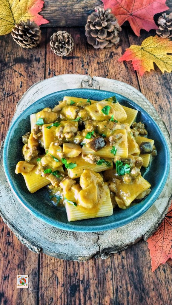 Die Paccheri mit Pilzen, Wurst und Kürbis sind ein Gericht, das den Herbst in seiner ganzen Pracht feiert, eine wahre Reise durch die Aromen und Farben dieser Jahreszeit. Ein echtes Komfortessen, das in die warmen Herbstlandschaften mit dem Duft des Waldes und des Kürbisses eintaucht, der die Luft erfüllt.