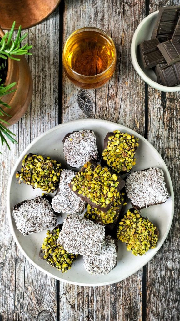 Nun schmelzen Sie auch die restliche Zartbitterschokolade und überziehen die Pralinen damit. Schließlich dekorieren Sie die eine Hälfte mit Pistaziengranulat und die andere mit geriebener Kokosnuss.Stellen Sie sie erneut auf das Tablett und lassen Sie sie 15 Minuten bei Raumtemperatur ruhen.