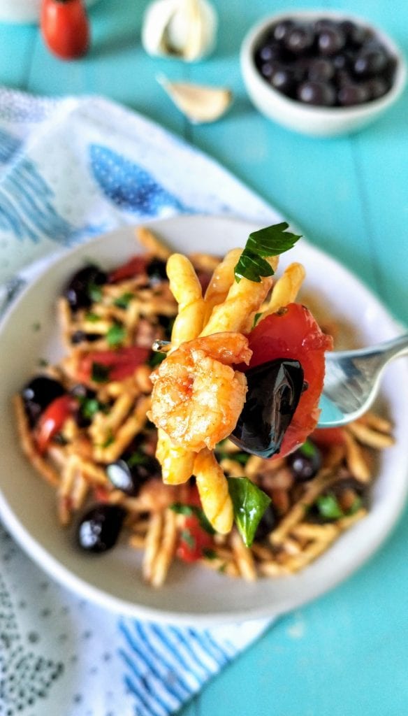 Die Pasta mit Garnelen und Oliven hält sich im Kühlschrank, in einem luftdichten Behälter aufbewahrt, für ein paar Tage.