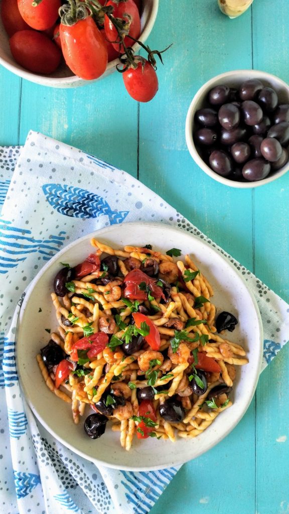 Jeder Bissen Pasta mit Garnelen und Oliven weckt Bilder von goldenen Stränden, die von kristallklarem Wasser umspült werden, und Sommerabenden, die in guter Gesellschaft verbracht werden. Dies ist ein Gericht, das für die Einfachheit der Zutaten und die intensiven Aromen steht, die eine perfekte Harmonie schaffen.